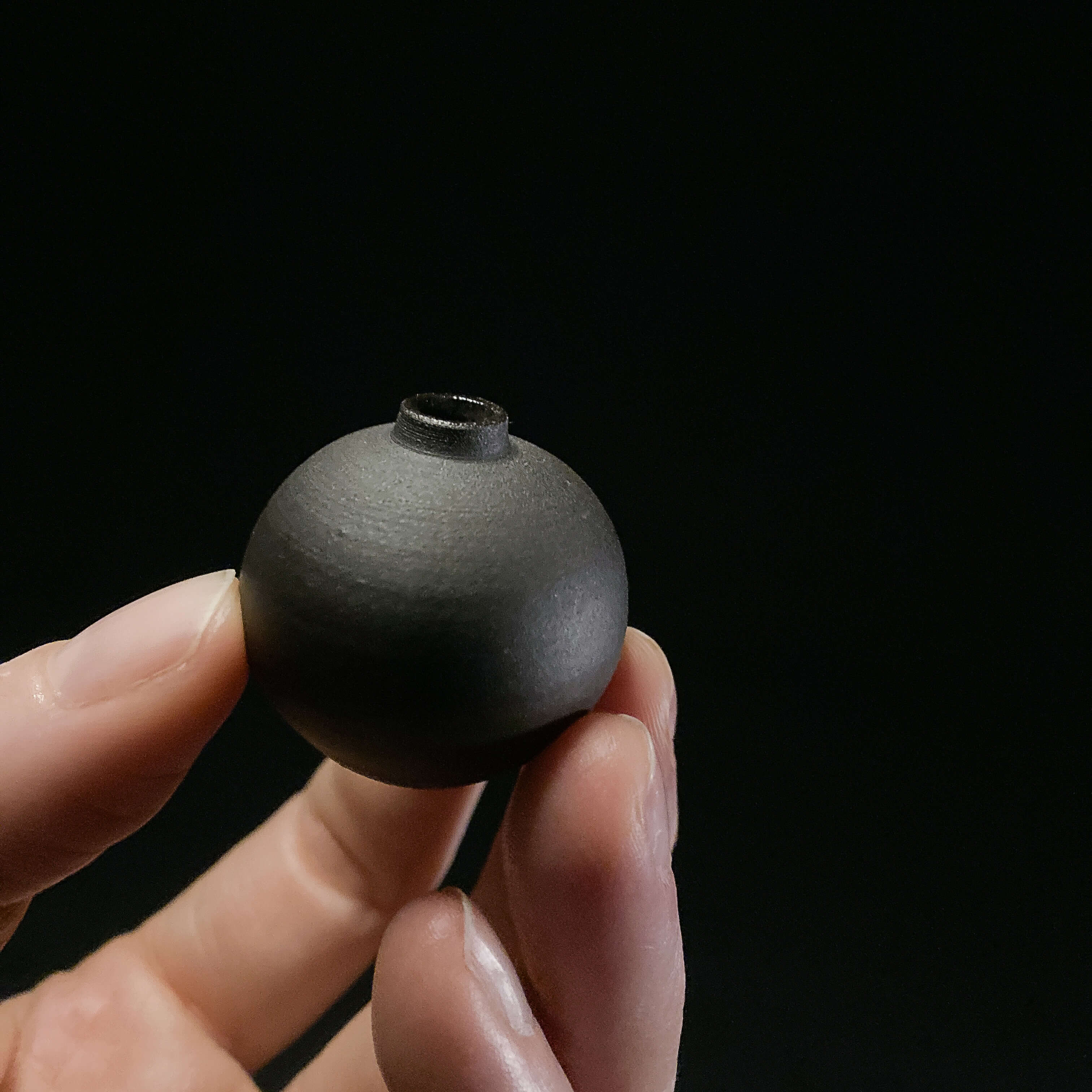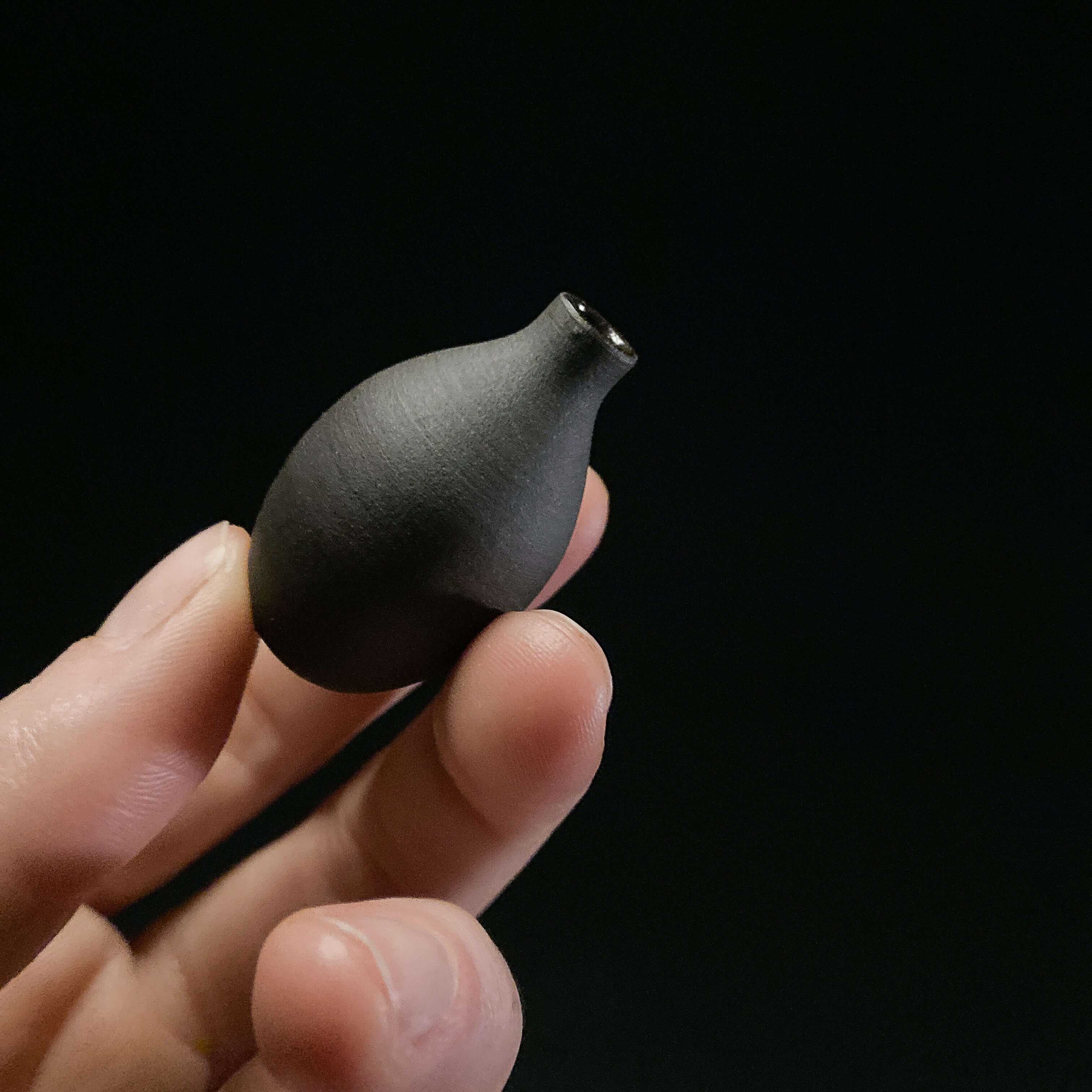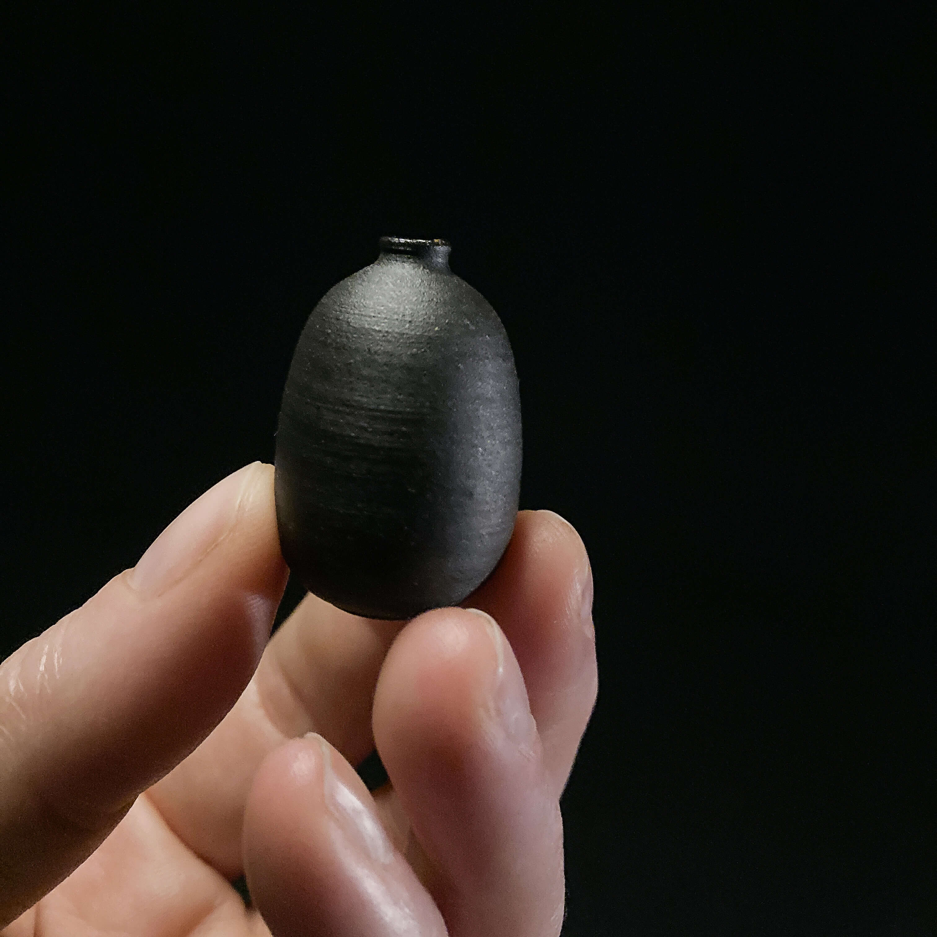Vases in dark stoneware clay. Entire interior is coated with the same dark, glossy glaze; exterior is left unglazed and lightly sanded. Corks are available as an optional add-on, and fitted for the vases.