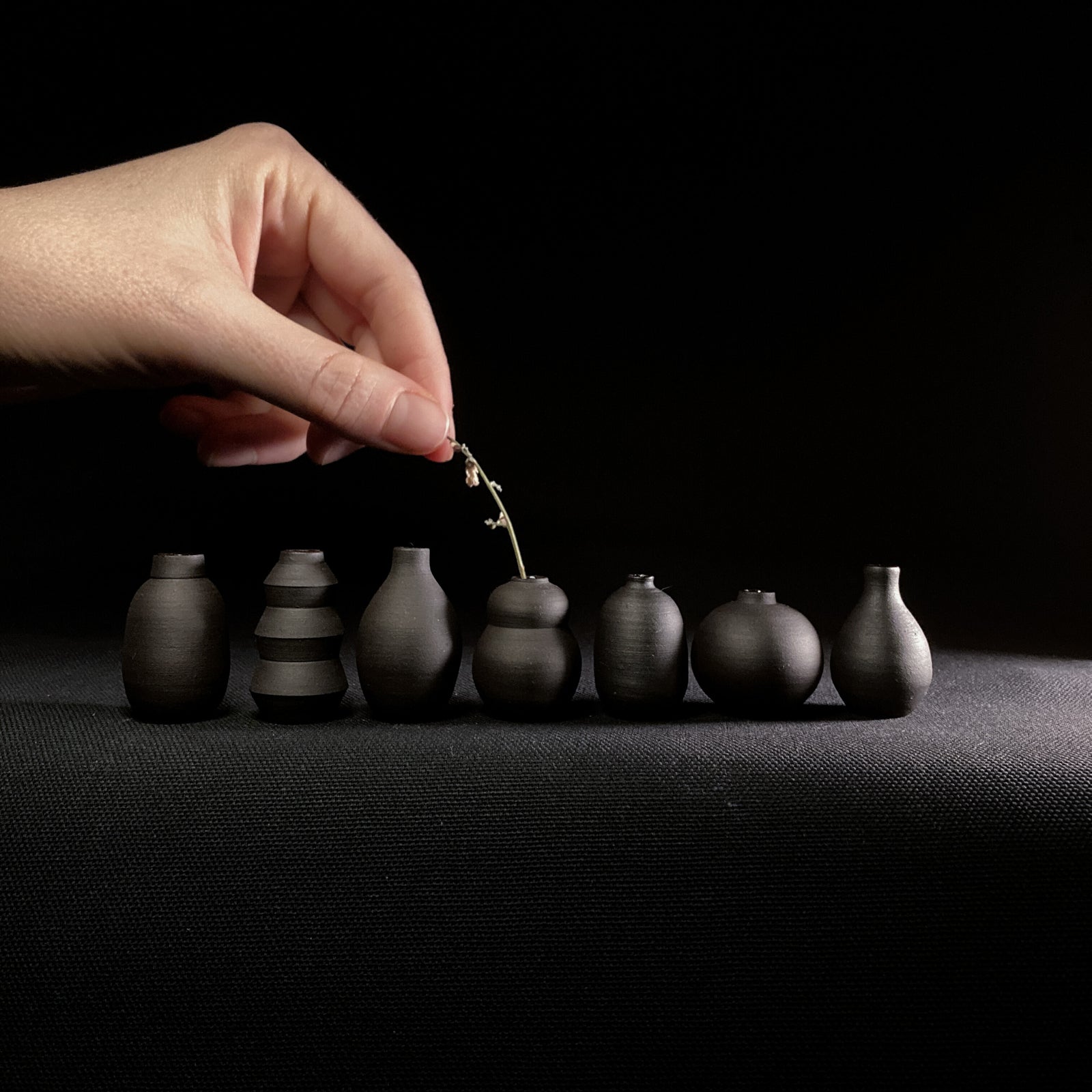 Wheel thrown on our tiny pottery wheel & kiln fired, so they all hold water; although most times we like to adorn them with little dried floral findings.