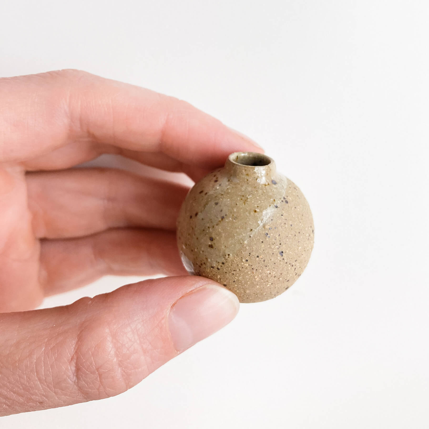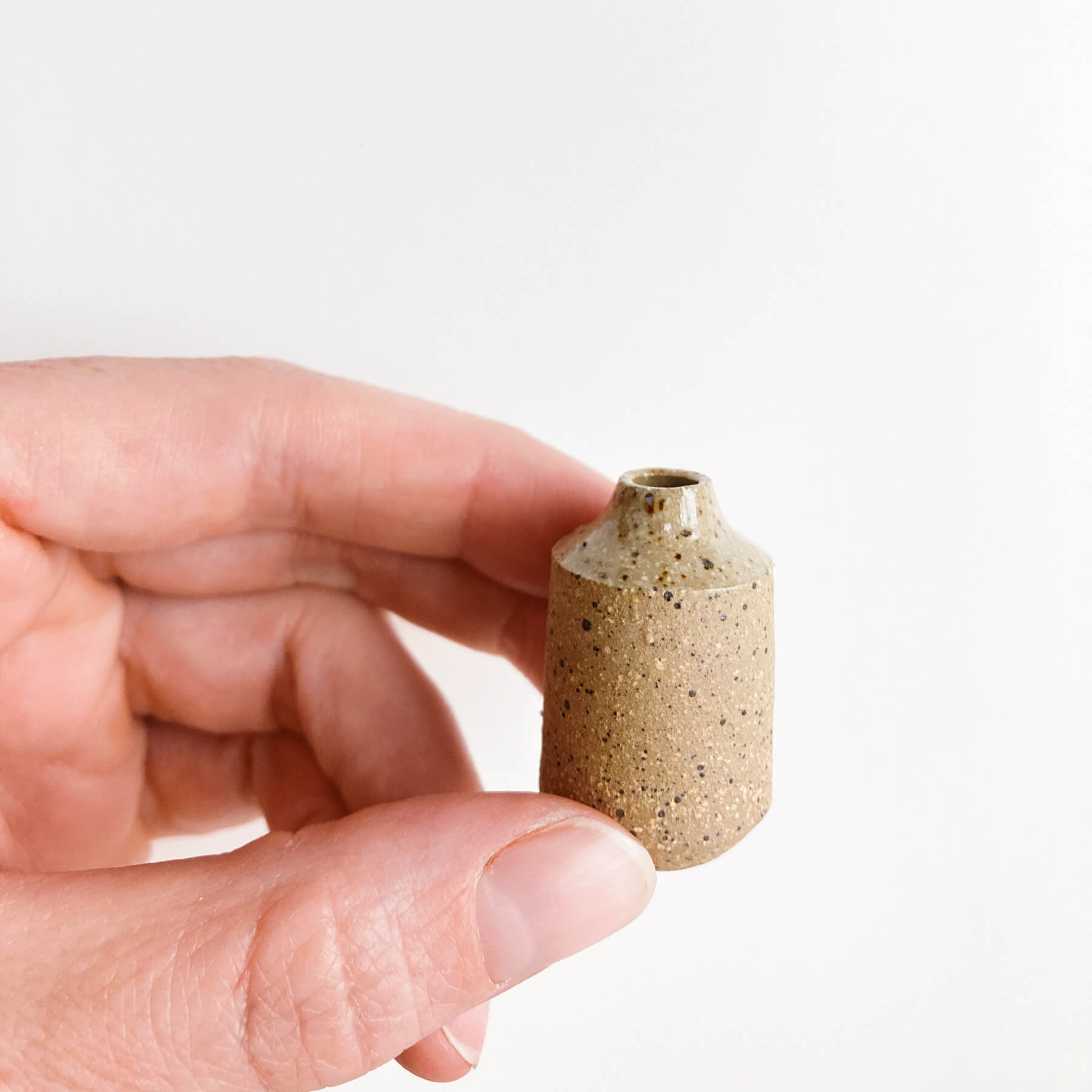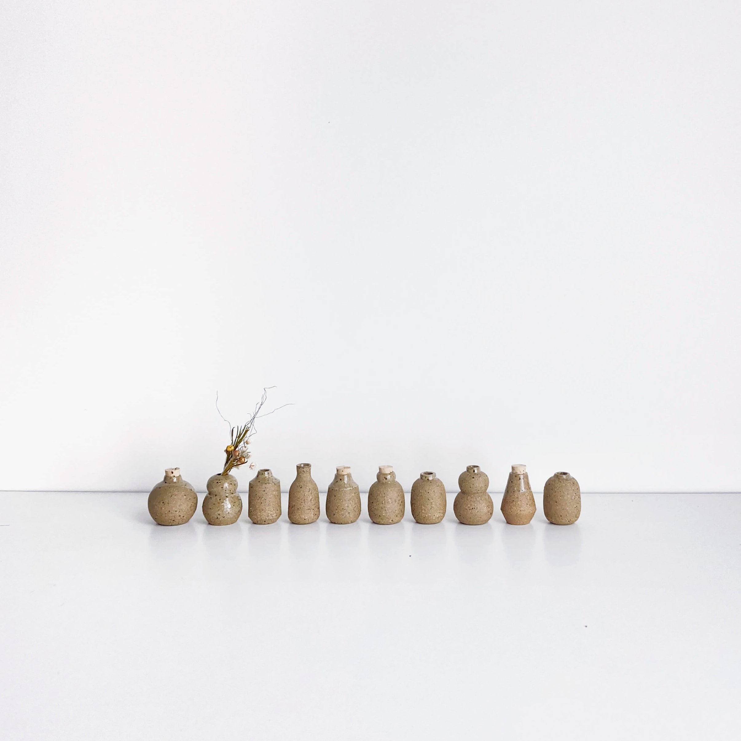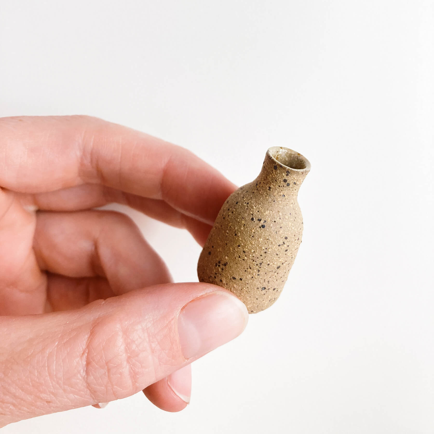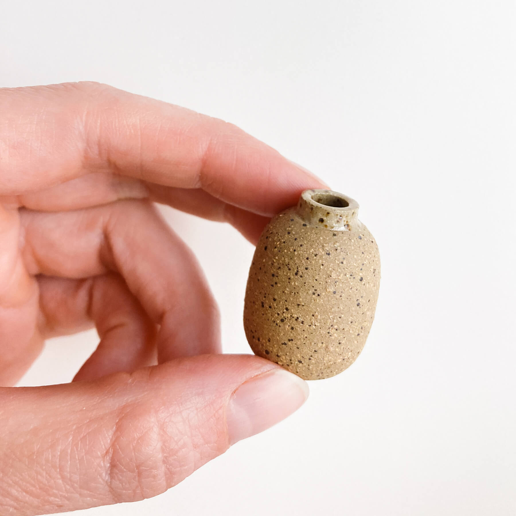 Wheel thrown on our tiny pottery wheel & kiln fired, so they all hold water; although most times we like to adorn them with little dried floral findings.
