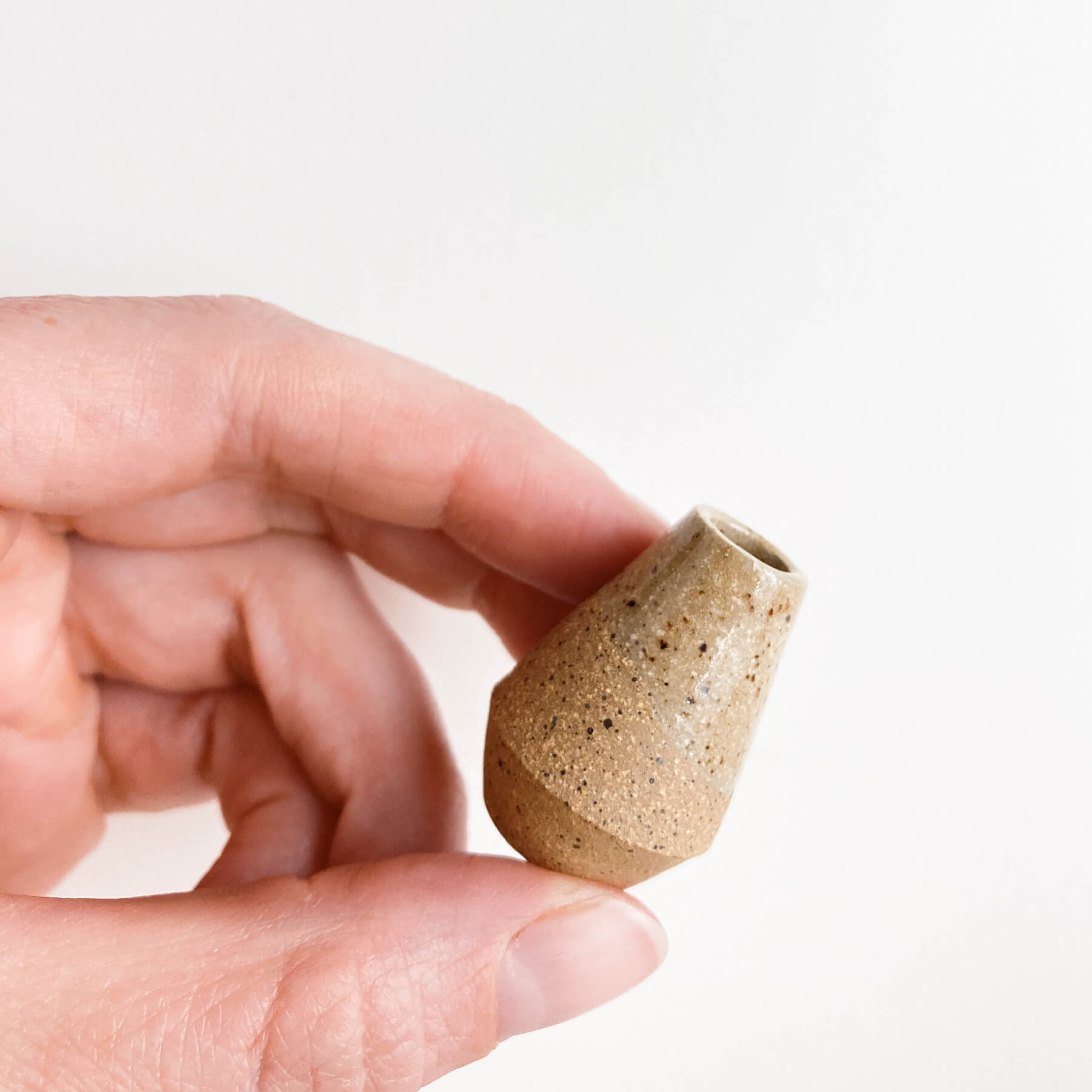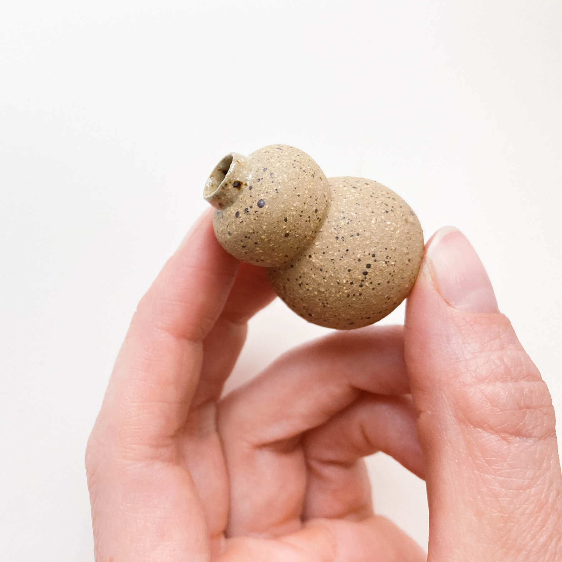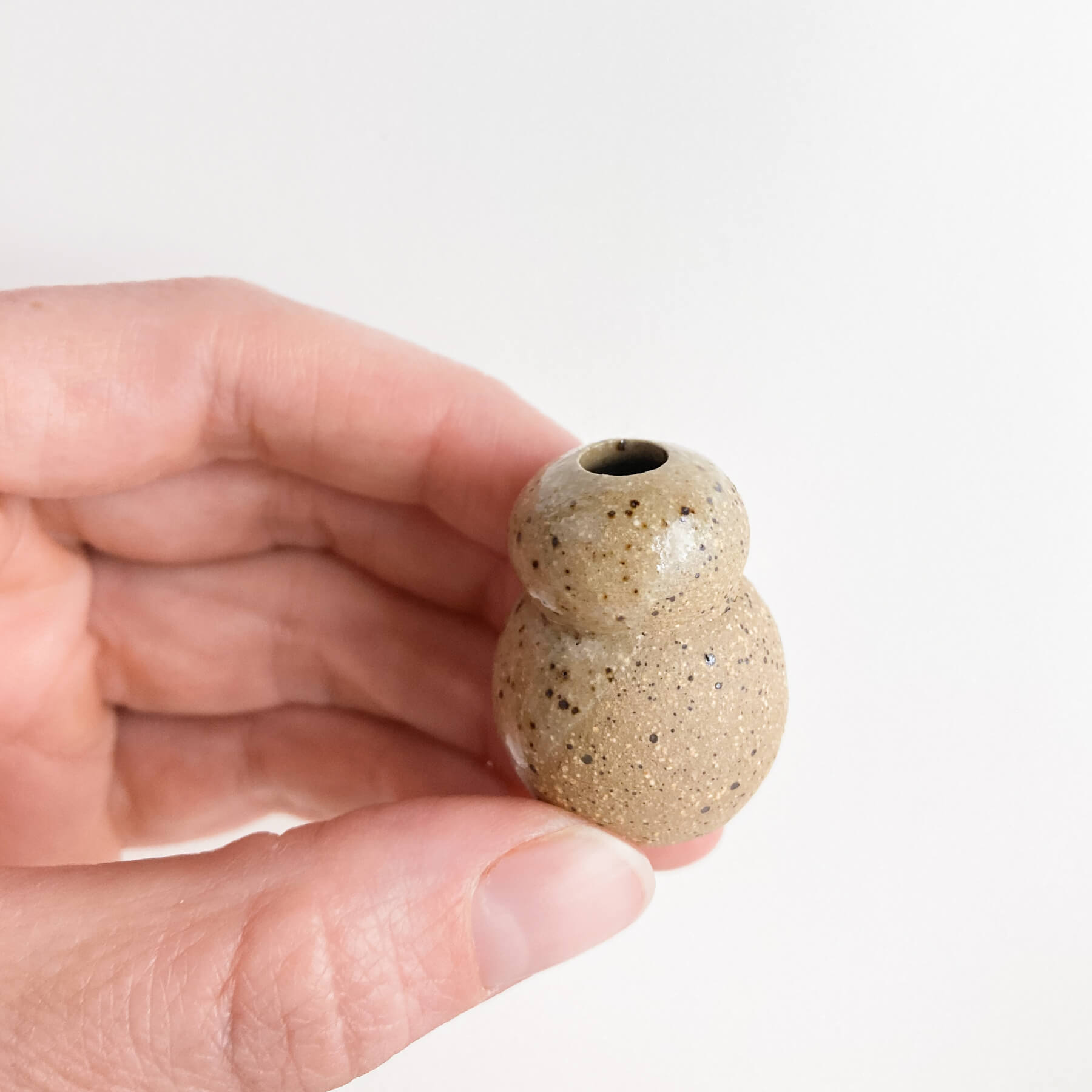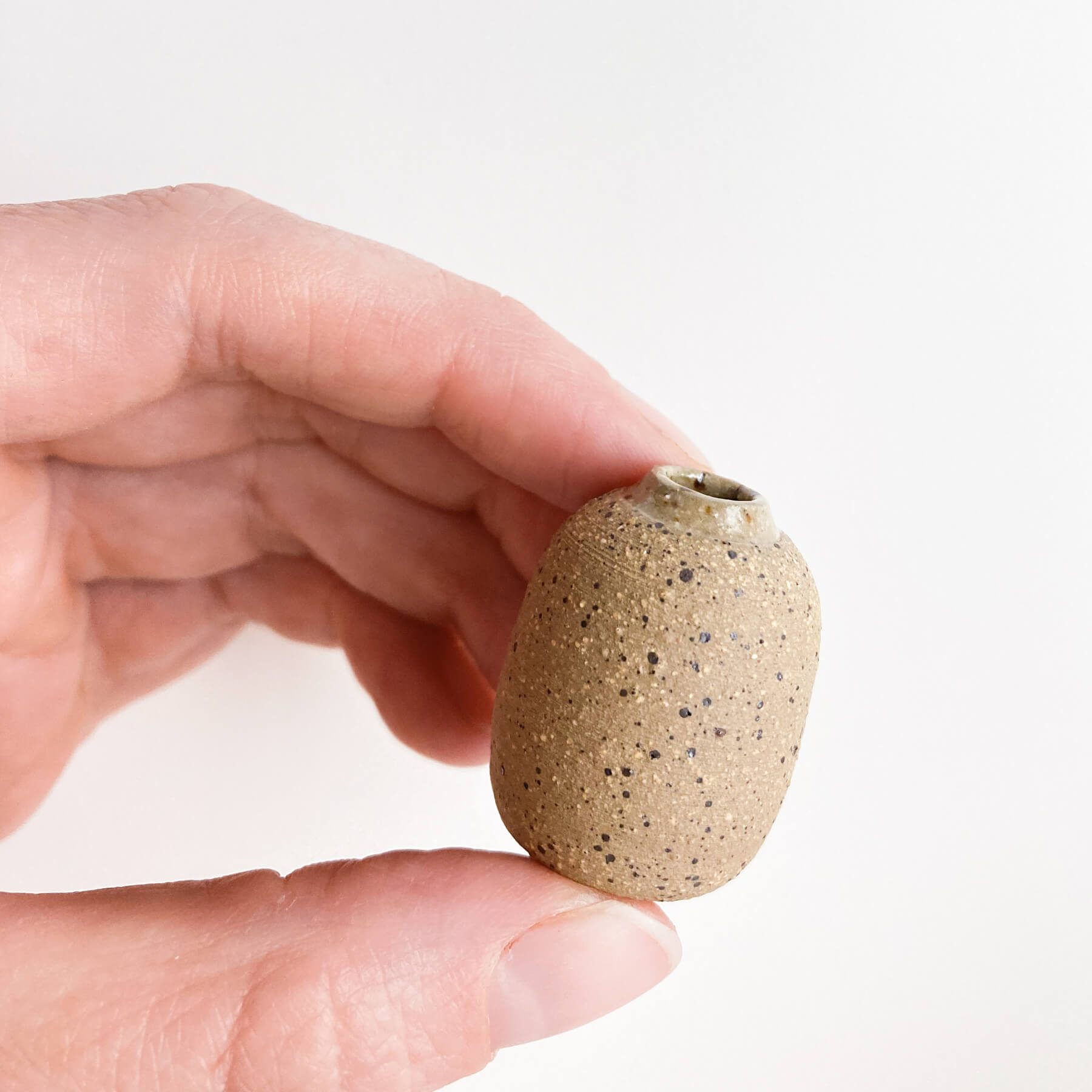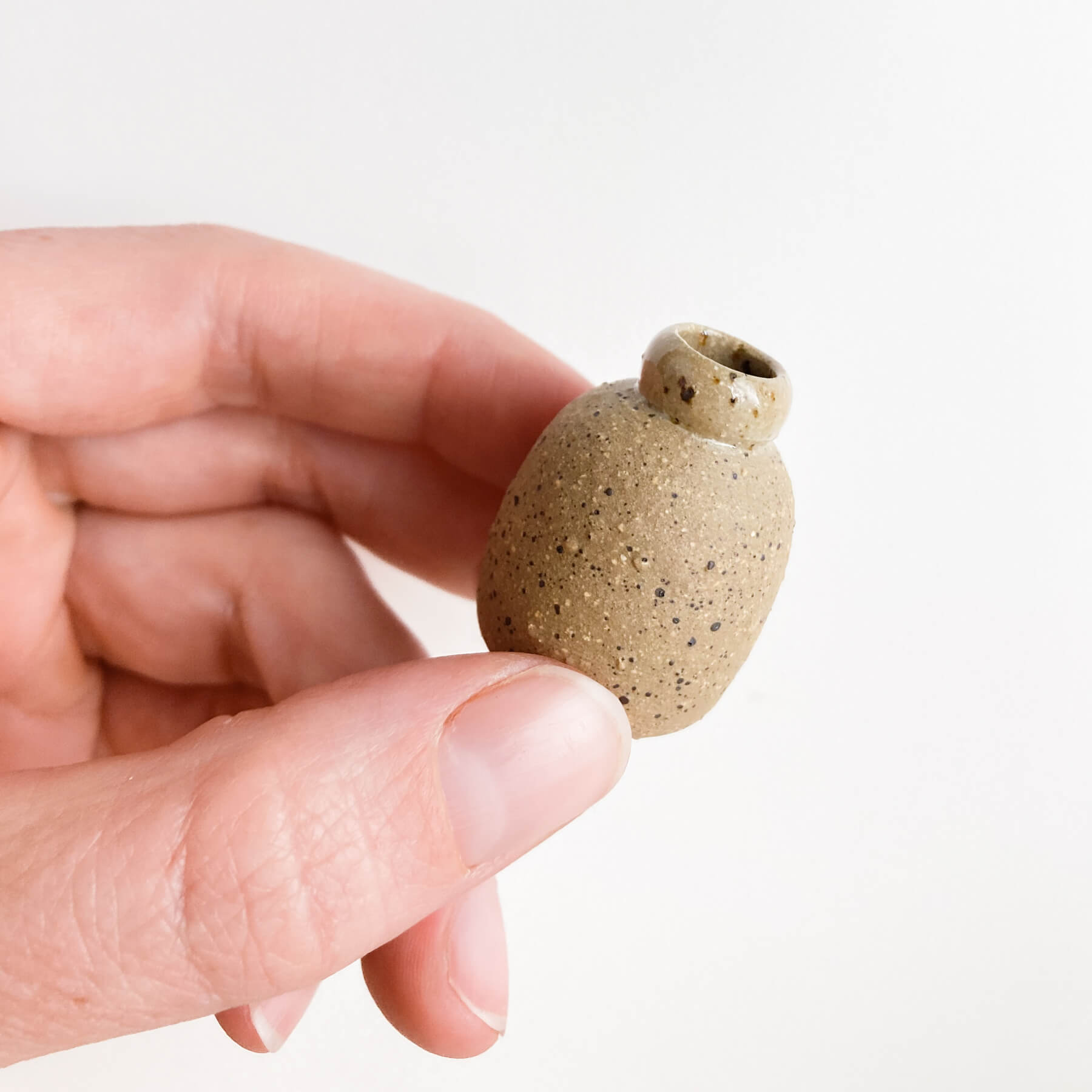 Wheel thrown on our tiny pottery wheel & kiln fired, so they all hold water; although most times we like to adorn them with little dried floral findings.