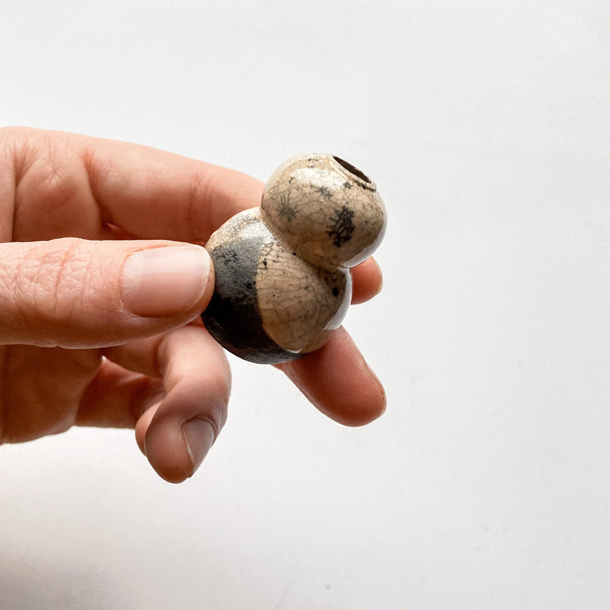 Raku fired and interior of all is lined with clear, glossy glaze that has variations of crackling. Exterior varies in accents of partial to no clear, gloss glaze. Raku is a method of bringing the pieces up to temperature, then quickly placing them in beds of flammables that ignite. This creates unpredictable cracks and variations in the glazes due to the quick temperature drop, as well as darkens the clay through exposure to smoke. Each image tries to represent them each as accurately as possible, although there will be variations in each angle due to the nature of the firing process.