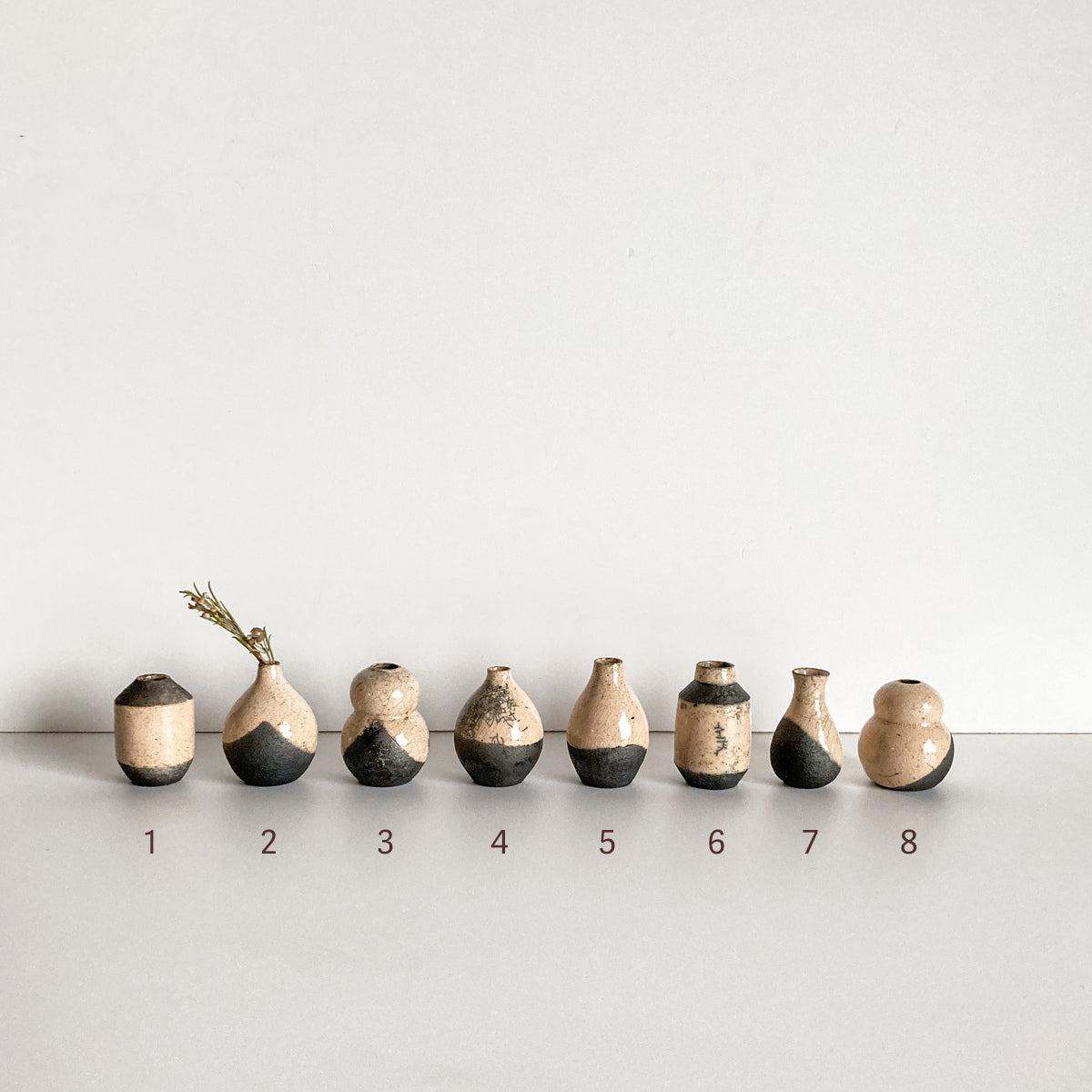 Price listed is for any individual, available tiny pot of the series, labeled 1-8 for reference, left to right; each is one of a kind. All are individually wrapped, packaged and boxed as gifts.