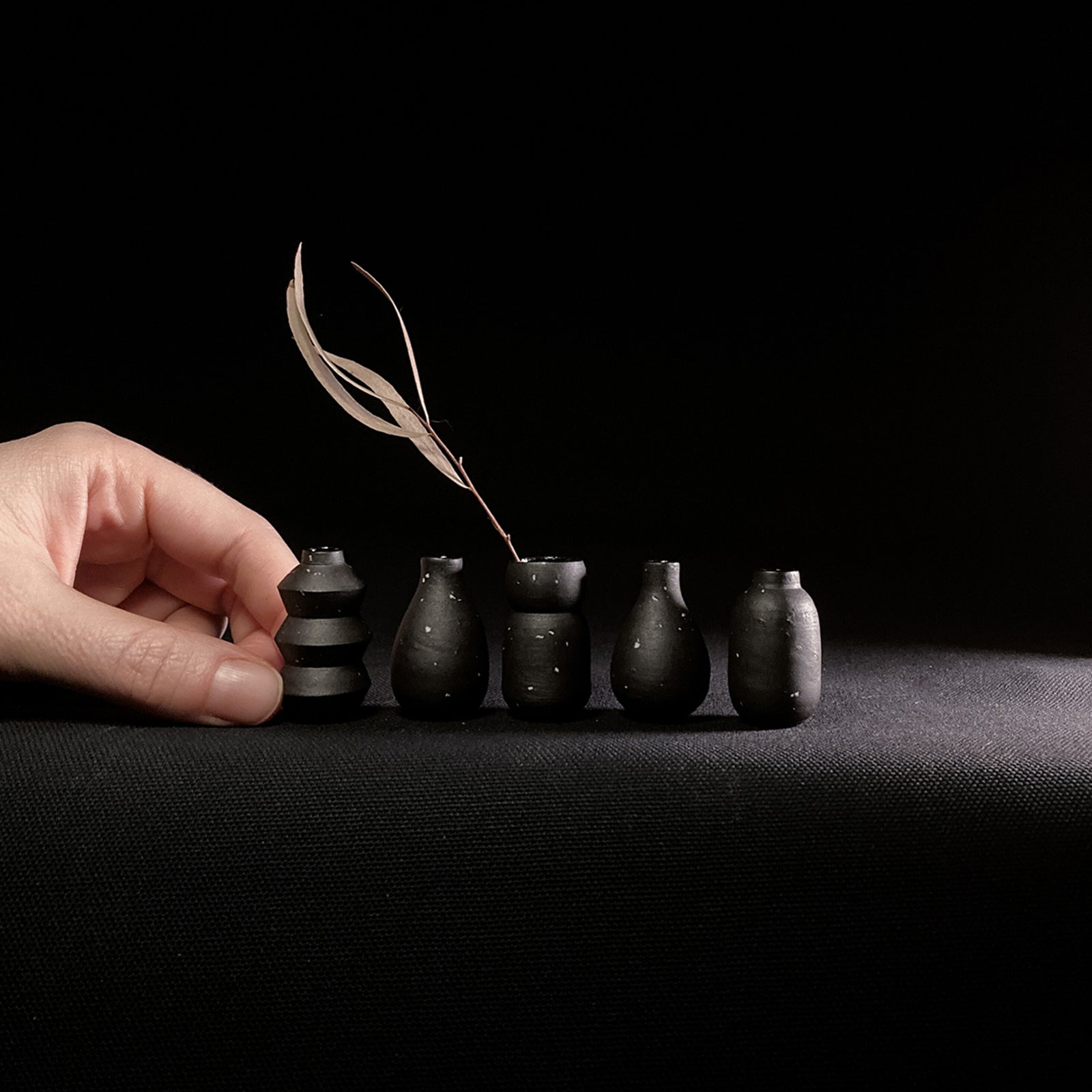 Wheel thrown on our tiny pottery wheel & kiln fired, so they all hold water; although most times we like to adorn them with little dried floral findings.